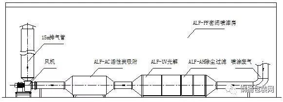 整套裝置由ALF-PF密閉噴漆房、ALF-AH除塵過濾、ALF-UV光解、ALF-AC活性炭吸附、管路、風(fēng)機(jī)組成。