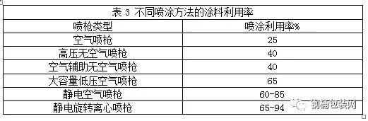 由表3可以看出,只有采用大容量低壓空氣噴槍或靜電噴涂才能滿足至少65%的涂料利用率。除此之外,采用機(jī)器人噴涂也可以提高涂料利用率,目前國內(nèi)涂裝行業(yè)正在推行內(nèi)噴機(jī)器人,即整條涂裝線噴涂實現(xiàn)無人化,全部使用機(jī)器人噴涂,_地提高了涂料的利用率。