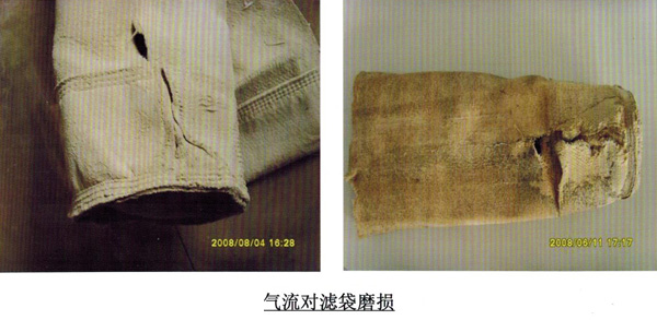 除塵器布袋在使用過程中經(jīng)常會出現(xiàn)除塵器濾袋口損壞的現(xiàn)象,而且這一現(xiàn)象出現(xiàn)還是比較嚴重的,到底是何原因致使除塵布袋漲圈下面20公分左右出現(xiàn)損壞呢?主要原因_是袋式除塵器的噴吹管上面打的噴吹眼不正,袋式除塵器噴吹管不正會直接影響除塵濾袋的使用壽命,濾袋的破損出現(xiàn)在距袋u向下左右處,此處???為側(cè)面破損沿噴吹管方向連續(xù)幾個排列,在煙氣流也方向側(cè)磨損較重,有的濾袋甚至發(fā)生圓周性斷裂,其破損應(yīng)為氣體攜帶灰粒由內(nèi)向外向下沖刷而成,濾袋內(nèi)部出現(xiàn)由上至下的大片織布磨損現(xiàn)象,并露出自色PTFE基布,分析原因為噴吹管噴吹時夾帶灰粒氣流被煙氣引流導(dǎo)致氣流偏斜至煙氣流出方向。對于針刺濾袋一部分_細粉塵進人纖維層內(nèi),噴吹氣流在清灰時因氣流不暢,不能很好將能量釋放,在袋內(nèi)形成強大的氣流而沖擊濾袋,造成濾袋晃動互相磨損袋底,以及將袋底吹裂。另一部分氣流從袋日返出,從而磨損袋口。濾袋底部側(cè)壁的作用力_加強大。此時,如果噴吹壓力偏大,袋身過濾含濕量大的煙氣后透氣性變差,袋底腐蝕“塑化”、強力下降,造成濾袋底部出現(xiàn)沿袋底縫線圓周折皺折裂痕跡。第四,該除塵器使用的為鋼袋籠,外部噴涂有機硅防腐材質(zhì)。由于使用年限較長,及_換除塵濾袋時對其磕碰導(dǎo)致部分防腐材料脫落,出現(xiàn)不同程度的銹蝕,袋籠的銹蝕對與濾袋的磨損與腐蝕影響也較大,使袋底強度降低。